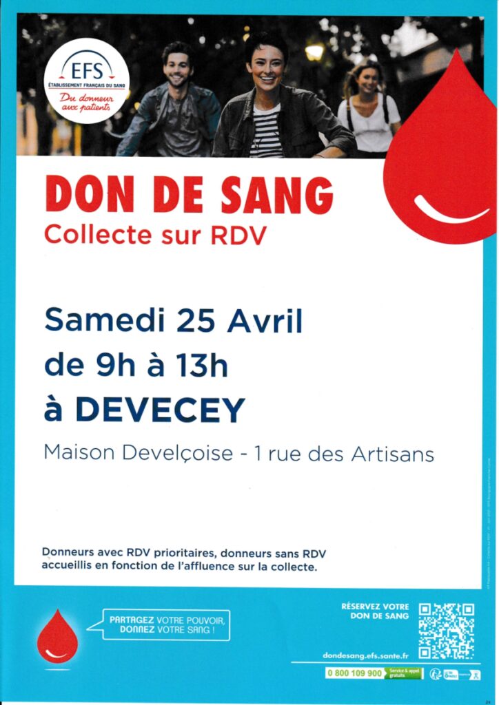 14 avril 2026 - In A la une‚ Vie associative By bonnay Comment off Nous vous attendons pour notre prochaine collecte de sang à Devecey !Ce sera le samedi 25 avril 2026 entre 9h et 13h ! Pensez à prendre rendez-vous https://dondesang.efs.sante.fr/ Prochaines dates à retenir. . . Samedi 27 juin 2026Samedi 22 août 2026Samedi 24 octobre 2026Samedi 19 décembre 2026A vos agendas ! Précédent Le Festival de Caves est devenu Les Souterraines Suivant Les Z’Abonnay. . .