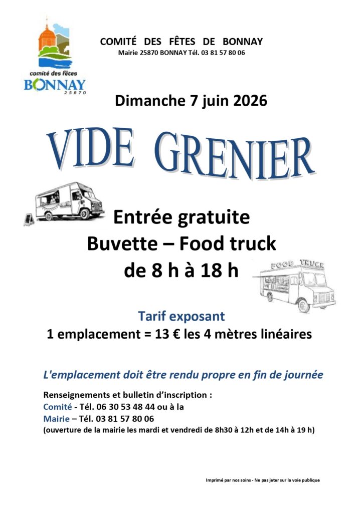 25 mars 2026 - In A la une‚ Activités‚ Cadre de vie‚ Vie associative By bonnay Comment off . . . Exposants ou visiteurs, nous vous attendons nombreux pour notre Vide Grenierdimanche 7 juin 2026 Si vous souhaitez vous inscrire, téléchargez le bulletin ICI7 juin Précédent Le PLUi, on en est où ? Suivant Les Z’Abonnay. . .